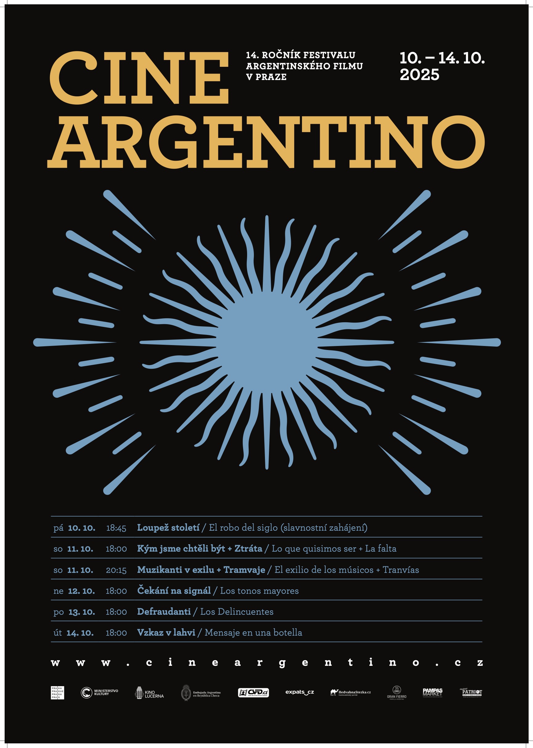Argentinské velvyslanectví v České republice je velmi poctěno, že může, společně s Kinem Lucerna, uskutečnit 14. ročník Týdne argentinského filmu, kulturní událost, která se již stala zjevným symbolem spřízněnosti argentinské a české kultury. Kulturní tradicí, jež nás sbližuje a připomíná nám, že nejsme na této cestě sami a nezáleží na tom, odkud pocházíme. Žádné kilometry, země a oceány nejsou dostatečnou vzdáleností, aby nás rozdělily.